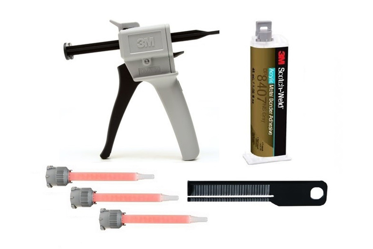 A 3M fémragasztó szerkezeti ragasztókészlet tartalmazza a 3M DP8407 NS ragasztót, egy applikátort, egy kinyomó dugattyút és három keverőfúvókát, jelentősen alacsonyabb áron, mint ha a ragasztót és az applikációs eszközöket külön vásárolná meg. 3M Scotch-Weld DP8407 NS egy nagy teljesítményű, kétkomponensű akril ragasztó szürke színben, amely kiváló nyírószilárdságot, leválási szilárdságot és ütésállóságot kínál. Kiváló tapadást biztosít számos műanyaghoz és fémhez. Ragasztás előtt csak minimális tisztítást vagy zsírtalanítást igényel. A ragasztó kiváló tartósságot biztosít a fémek (beleértve a nyers acélt, rezet, sárgarezet, bronzot és horganyzott acélt) kötéseinél, még akkor is, ha magas hőmérsékletnek és nedves környezetnek vannak kitéve. Feldolgozási idő: 5-7 perc. A szerkezeti szilárdság elérése: 32 perc. Technikai paraméterek rendszer:kétkomponensű ragasztó, 10:1, EPX alap:metil-metakrilát hőállóság:150 °C UV-állóság:nagyon jó nedvességállóság:nagyon jó vegyi anyagokkal szembeni ellenállás:nagyon jó alkalmazás:duokartus EPX applikátorral