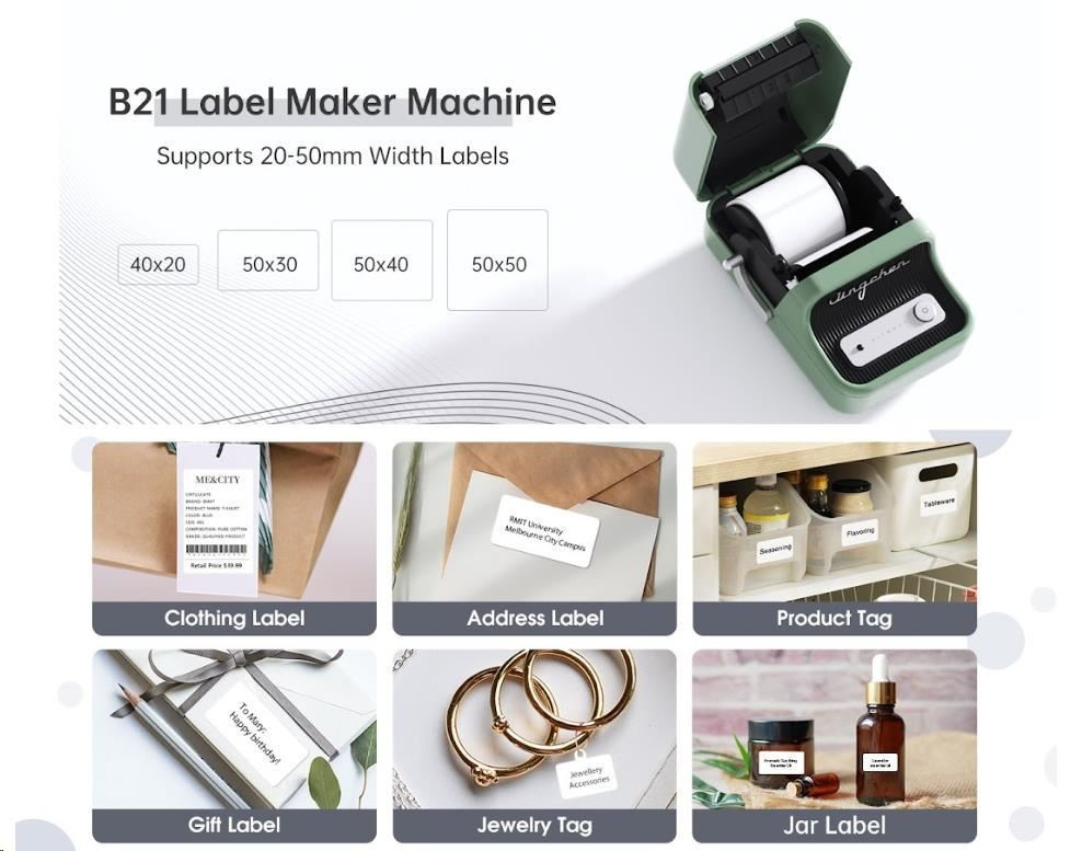 Niimbot Smart B21 címkenyomtató 1AC19031602, USB-C töltőkábel, fehér címkék tekercse 50 x 30 mm (210 db), felhasználói kézikönyv