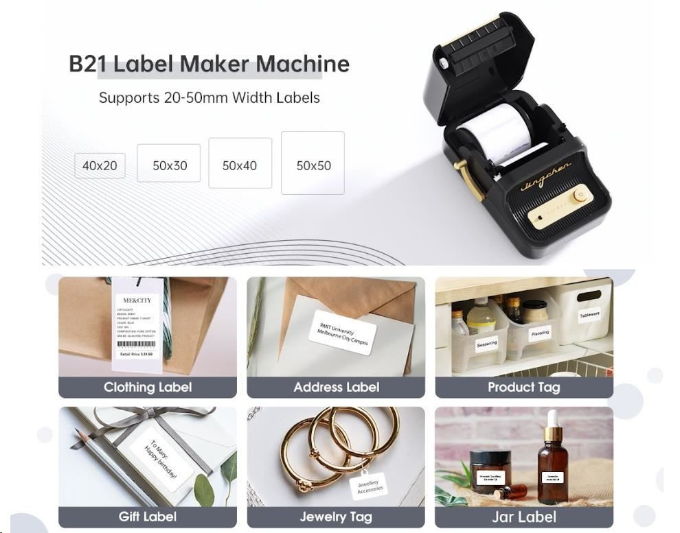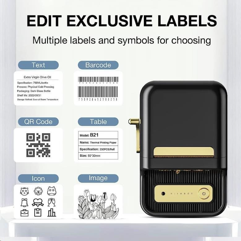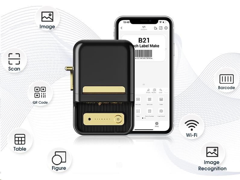 Niimbot Smart B21 1AC19051601 címkenyomtató egy nagy teljesítményű hordozható címkenyomtató, amely ötvözi a modern technológiát, a felhasználóbarát kezelhetőséget és a kiváló nyomtatási minőséget. Ez a Niimbot B21 hőcímkenyomtató úgy lett tervezve, hogy képes legyen pontos és tartós címkék nyomtatására irodában, boltban, raktárban és útközben is — festék vagy toner használata nélkül.