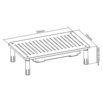 Specifikációk Alkalmas: laptop, monitor Alkalmas képernyőméret: 13" ~ 32" Állítható magasság: 10/12/14 cm Anyag: acél + műanyag Méretek: 370 x 235 x 140 mm Felület vastagsága: 0,9 cm Teherbírás: 20 kg